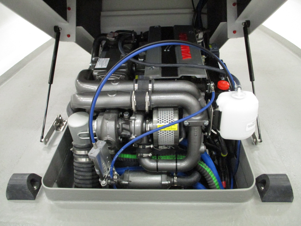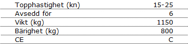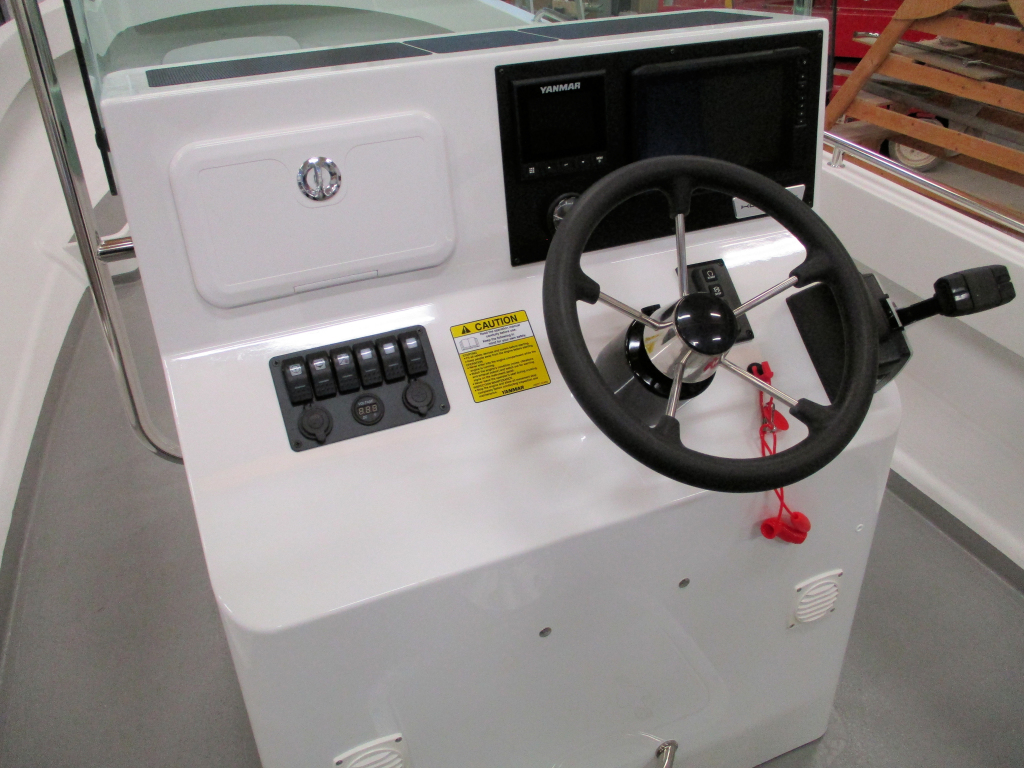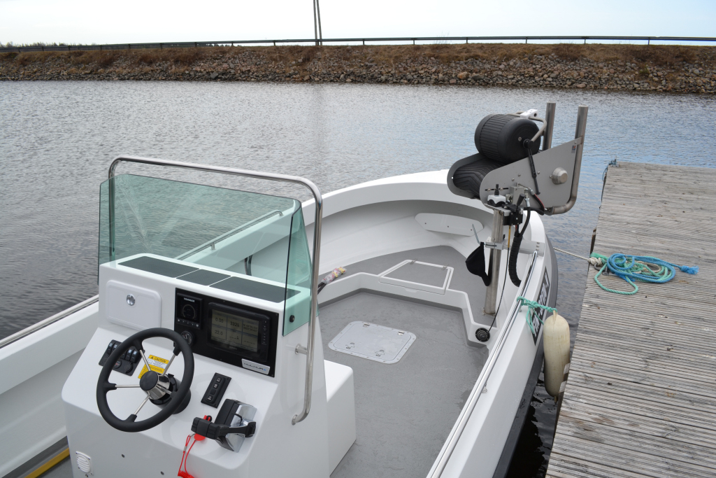 Grundutrustningen i båten är heltäckande, med bl.a. hydraulisk styrning och robusta räcken vid sidorna av båten.