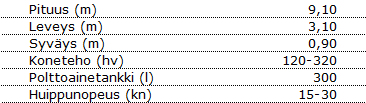 Veneen moottori ja varustevalikoima on laaja. Näin voidaan optimoida käyttökustannukset ja soveltuvuus asiakkaan tarpeet huomioiden.