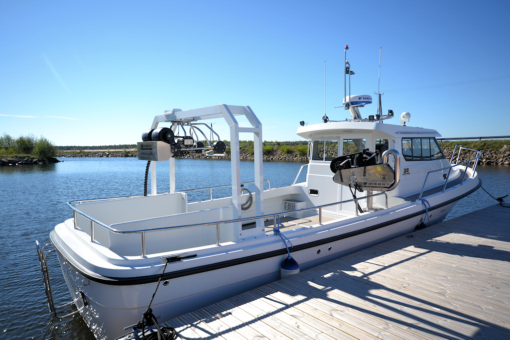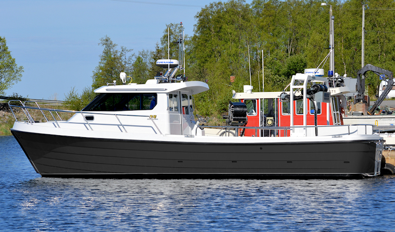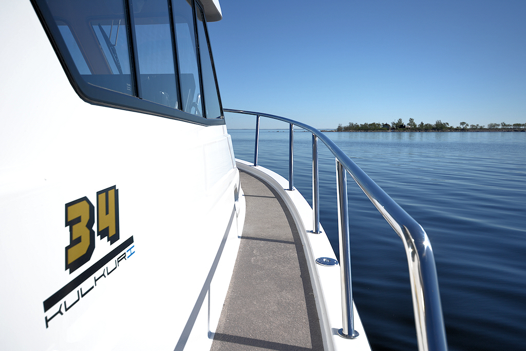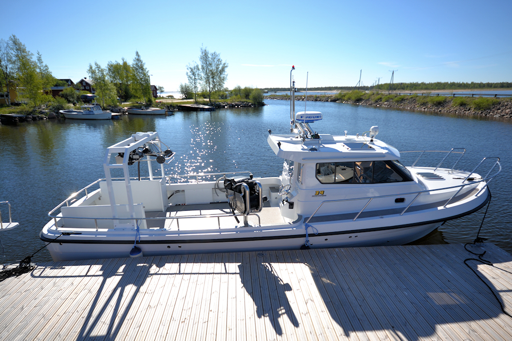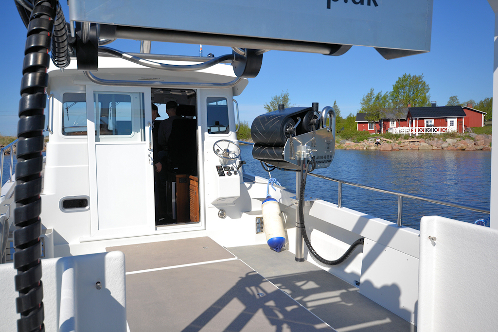 Laaja lisävarustevalikoima takaa veneen soveltuvuuden monenlaisiin käyttötarkoituksiin. Kuormausnosturilla varustettuna Kulkuri 34 voi kuljettaa esimerkiksi rakennustarvikkeita saaristoon helposti.